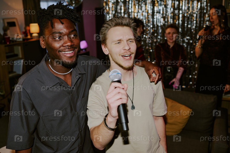 Белый мужчина поет караоке с молодым чернокожим человеком на вечеринке