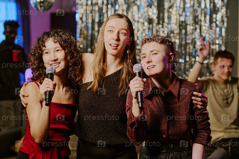 Три молодых взрослых женщины вместе поют и улыбаются на праздничном собрании