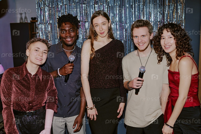 Группа молодых взрослых многонациональных друзей, держащих микрофоны на вечеринке