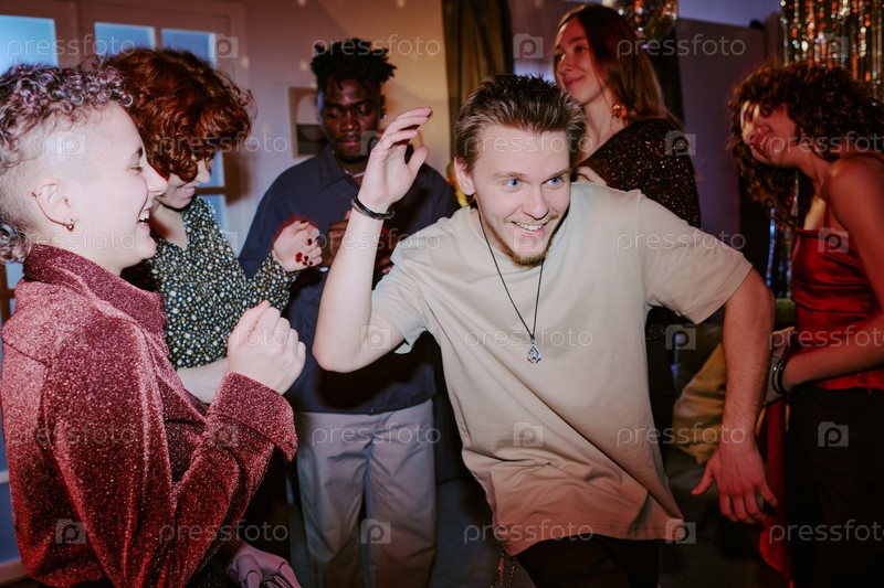 Группа молодых взрослых, танцующих и общающихся на закрытой вечеринке