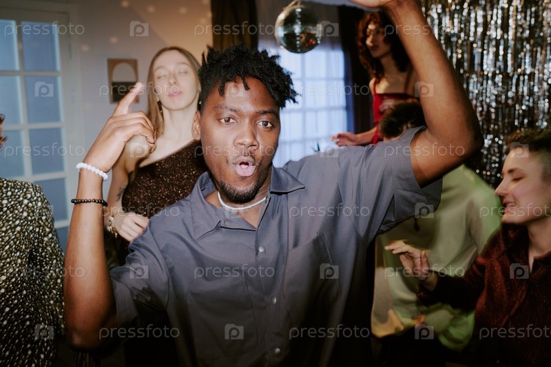 Молодой чернокожий мужчина танцует энергично на вечеринке с различными друзьями в помещении