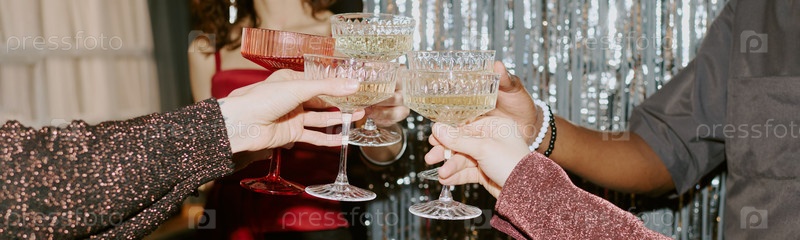 Руки молодых мультиэтнических взрослых, стучащих бокалы с шампанским на праздновании