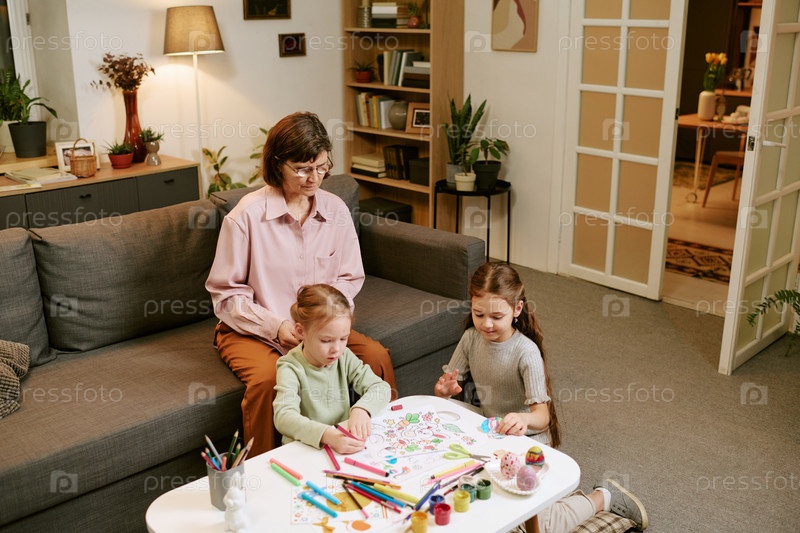 Бабушка наблюдает за двумя девочками, рисующими в помещении