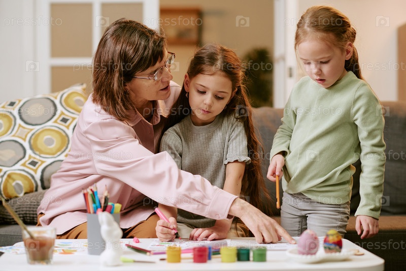 Бабушка и дедушка учат двух девочек рисовать в помещении