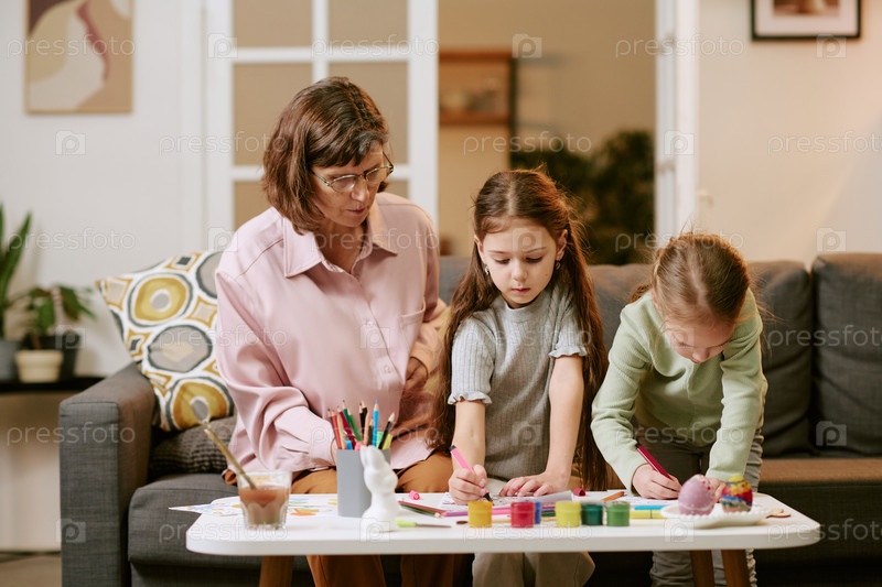 Старшая женщина помогает двум девочкам рисовать в помещении