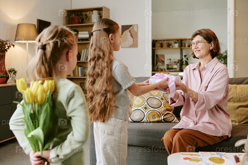 Пожилая женщина получает подарок от двух молодых девушек в помещении