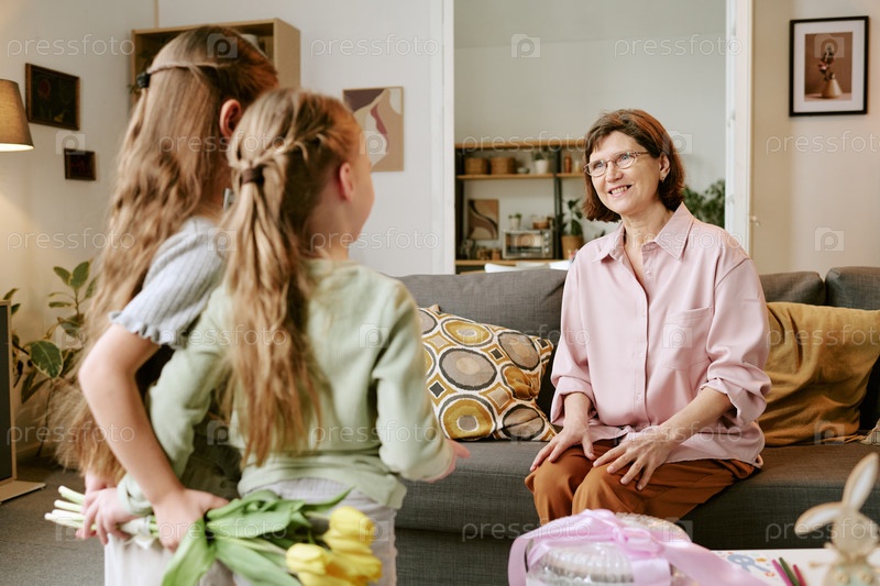 Старшая женщина улыбается, приветствуя двух молодых девушек в помещении
