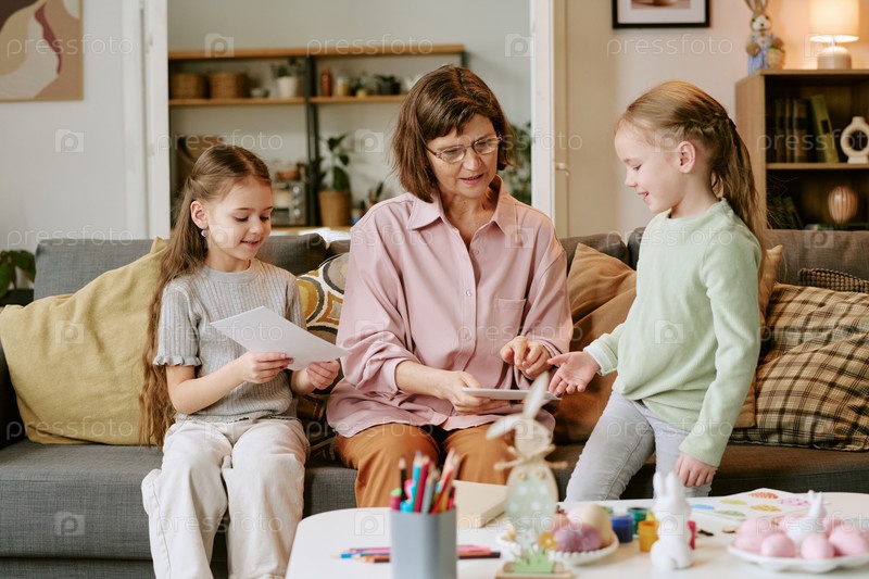 Женщина среднего возраста обучает двух девочек искусству и ремеслам