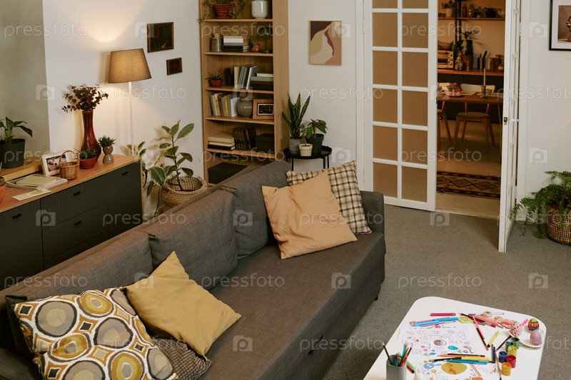 Интерьер гостиной с диваном и столом с детскими предметами искусства