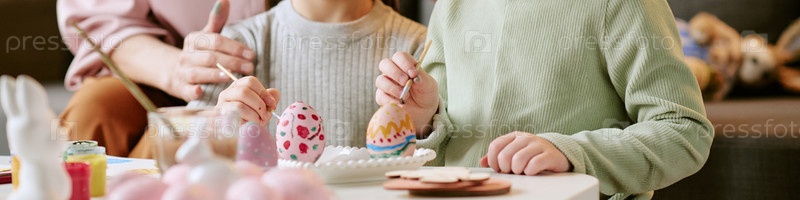 Заголовок двух детей, рисующих пасхальные яйца вместе дома во время праздника