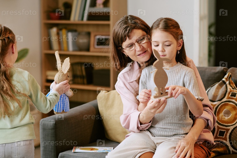 Женщина среднего возраста помогает молодой девушке собирать игрушку