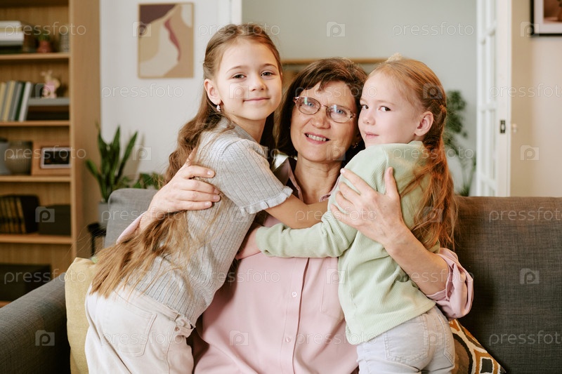 Женщина среднего возраста обнимает двух девушек в помещении, улыбаясь