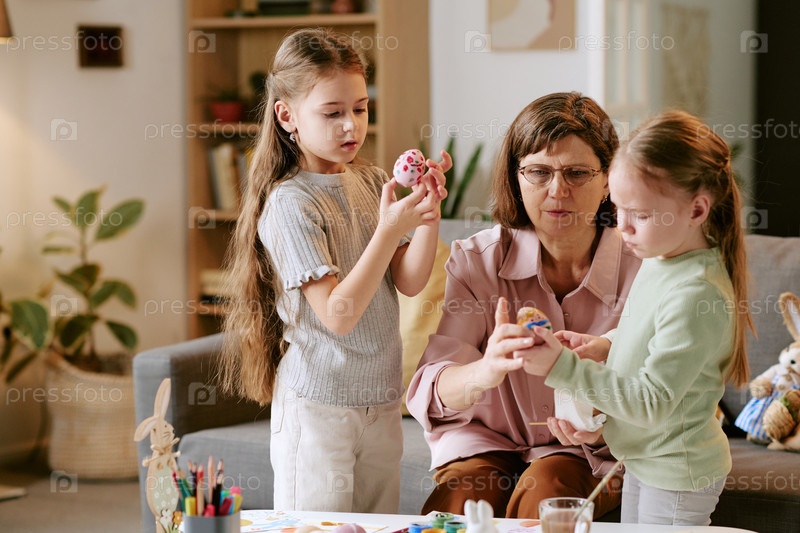 Женщина средних лет помогает двум девочкам рисовать пасхальные яйца