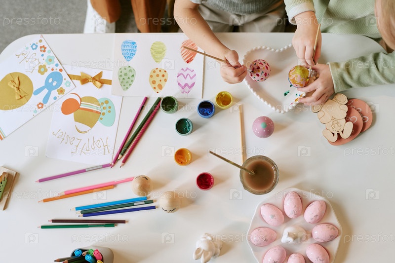 Дети красят пасхальные яйца и рисуют праздничные украшения вместе