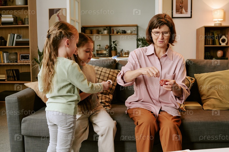 Женщина среднего возраста преподает двум детям ремесленные навыки в помещении