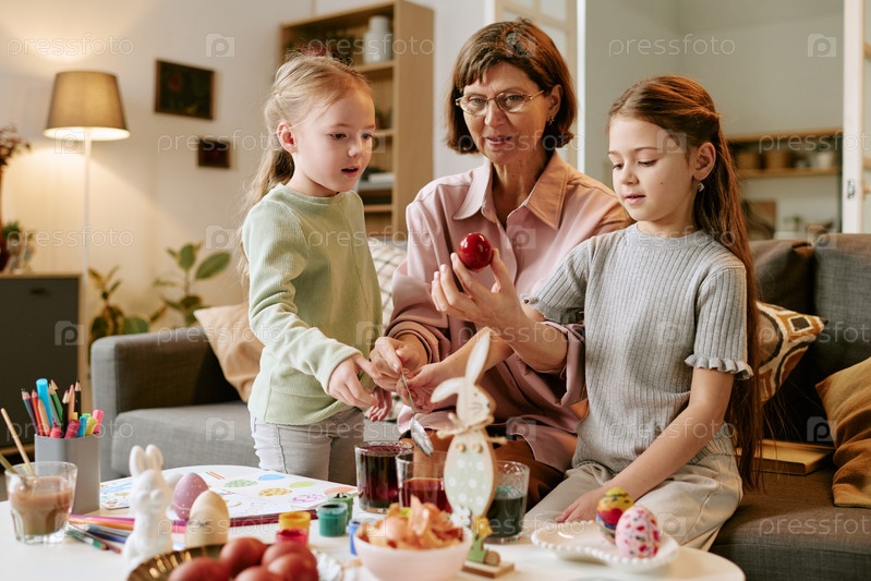 Женщина среднего возраста направляет двух девушек, разрисовывающих пасхальные яйца вместе