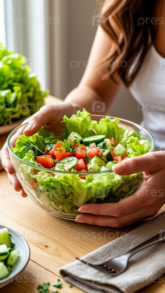 Молодая женщина подает на стол свежий салат у себя дома на кухне. Концепция здорового питания. Салат из свежих овощей в салатнике на столе