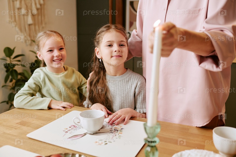 Две девушки улыбаются, сидя за столом с взрослыми подсвечивая свечу