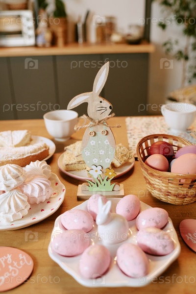 Пасхальный стол с изображением окрашенных яиц и выпечки во время весеннего праздника