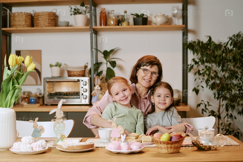 Старшая женщина обнимает двух молодых девушек, улыбаясь за кухонным столом