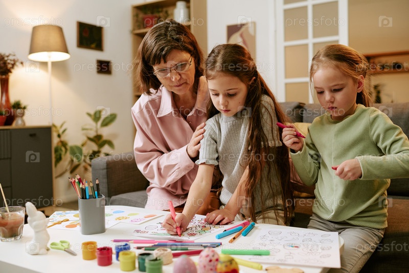 Женщина средних лет помогает двум девушкам рисовать вместе