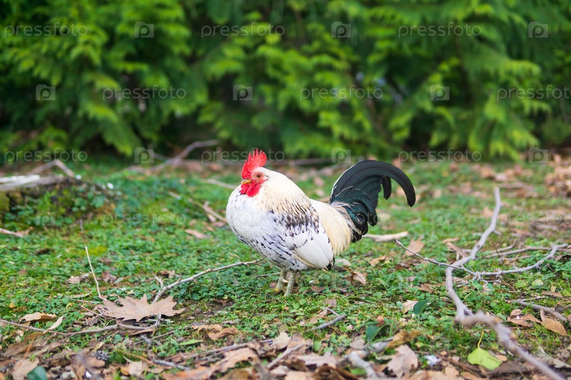 Белый петух на зеленой траве в саду