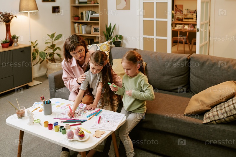 Бабушка наблюдает за двумя девочками, создающими пасхальные произведения искусства в помещении