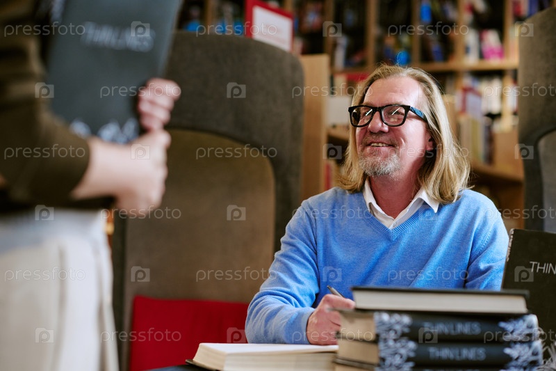 Кавказский мужчина средних лет улыбается, подписывая книги во время презентации