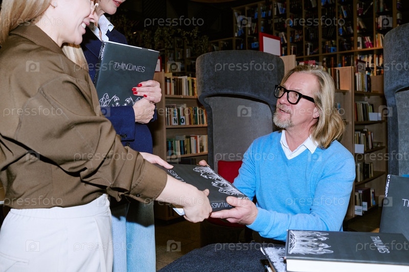 Кавказский мужчина средних лет подписывает книгу во время презентации в библиотеке