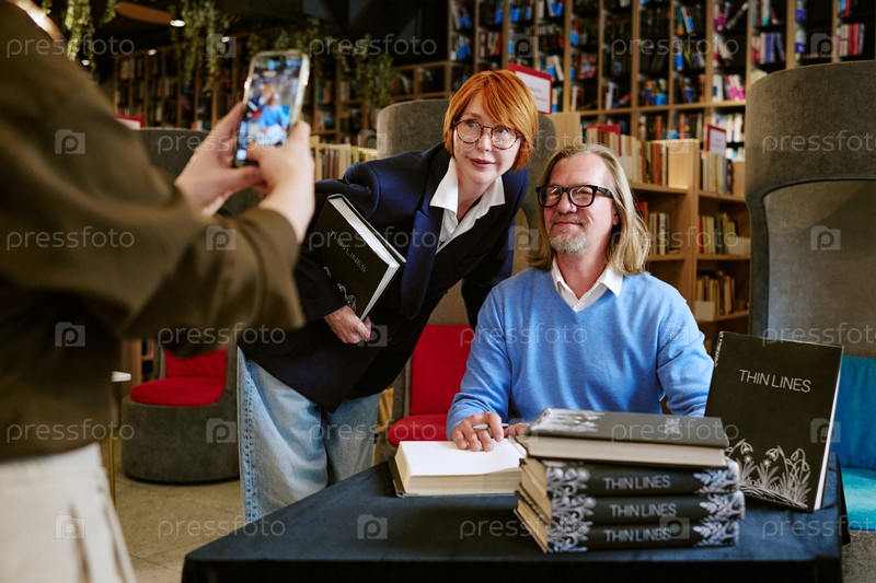 Кавказский мужчина средних лет, подписывающий книгу с кавказской женщиной среднего возраста, позирующей