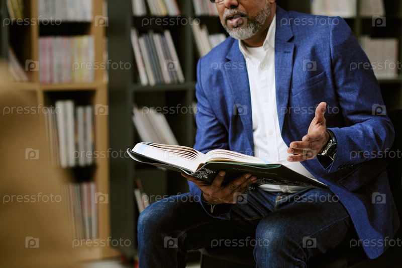 Человек среднего возраста, представляющий книгу во время образовательной презентации