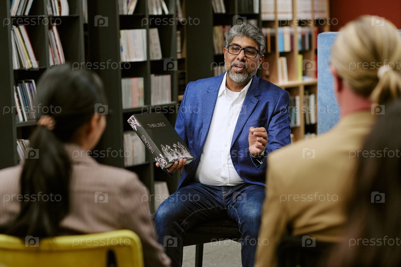 Мужчина средних лет представляет книгу разным взрослым аудиториям в библиотеке