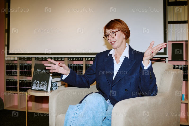 Кавказская женщина средних лет делает жесты, пока представляет книгу во время семинара