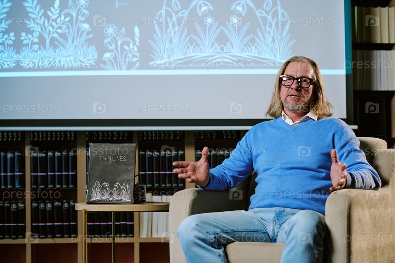 Кавказский мужчина средних лет объясняет темы книги во время образовательного семинара