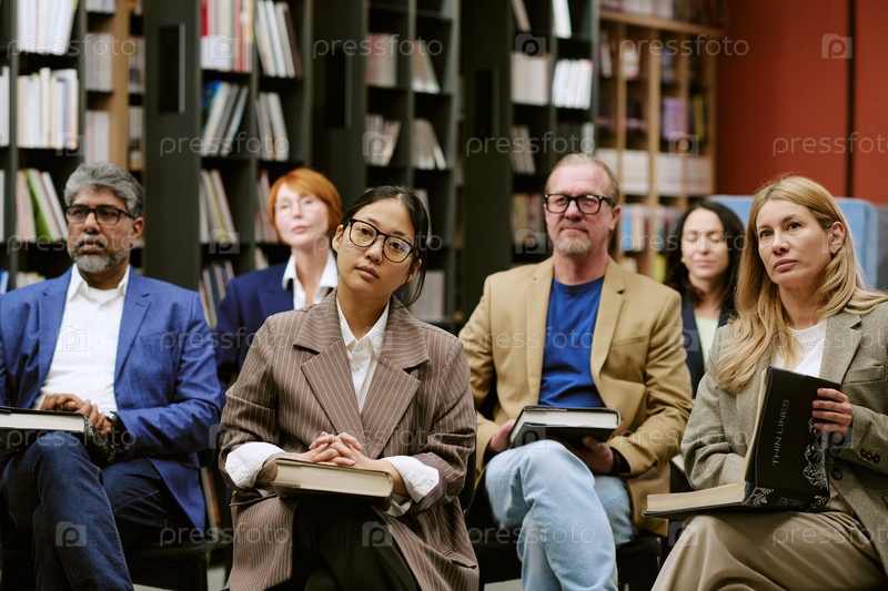 Разнообразная группа разных взрослых, посещающих презентацию книг в библиотеке