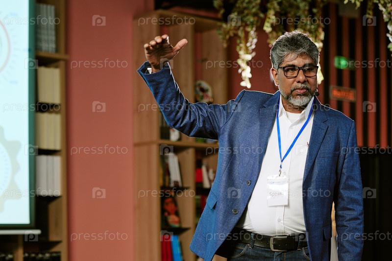 Южноазиатский мужчина средних лет дает презентацию перед книжной полкой
