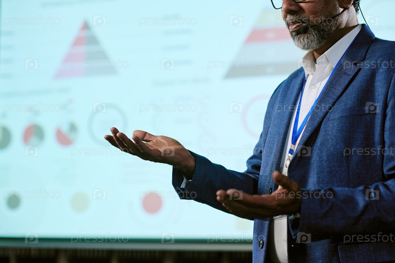 Мужчина среднего возраста жестикулирует, представляя данные во время семинара