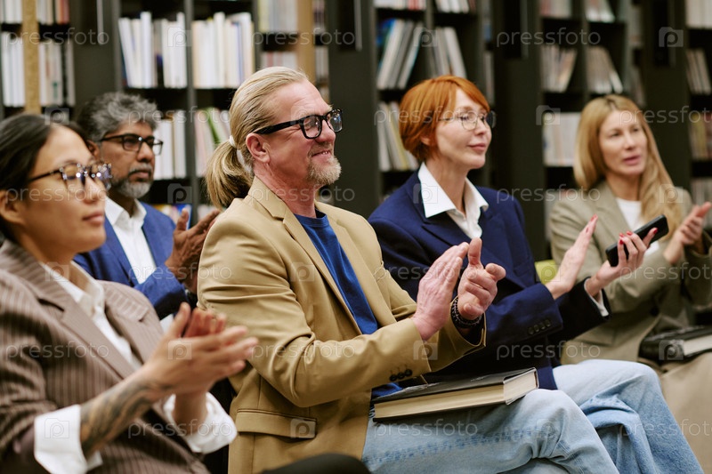 Разнообразная группа людей, аплодирующих во время презентации книги