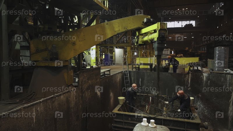 Работники литейного завода наливают расплавленный металл в форму