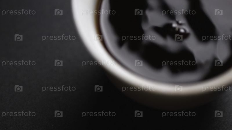 Ближайший снимок жидкости, изящно залитой в ярко белую чашку, обрамленную глубоким темным фоном