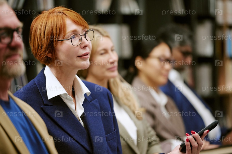 Белая женщина среднего возраста, посещающая презентацию с разнообразной аудиторией