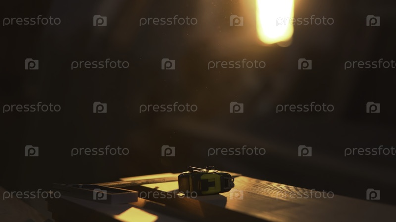 Сцена измерительного инструмента, деревянная скамейка с лентой измерения, близкий взгляд на измерительное устройство на скамейке . медиа