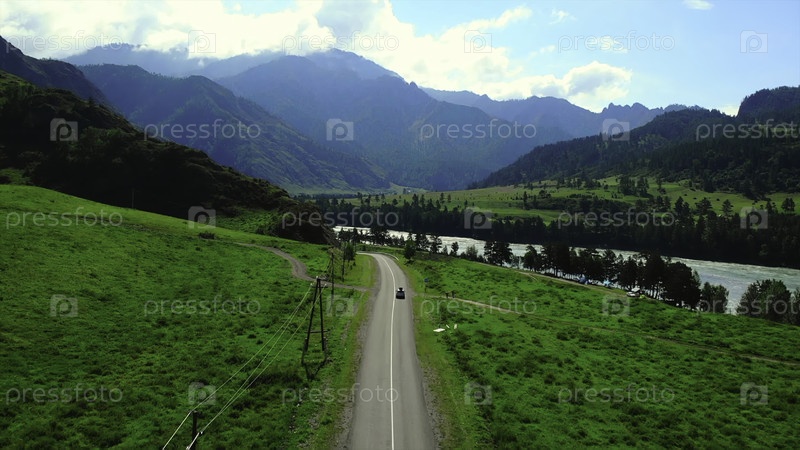 Воздушный дрон следит за автомобилем, который едет по горной дороге
