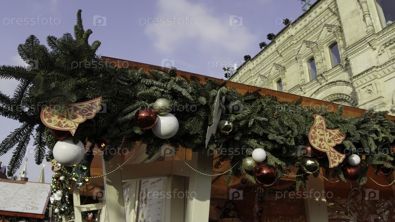 Рождественские декорации украшают праздничный рыночный киоск на Красной площади, Москва