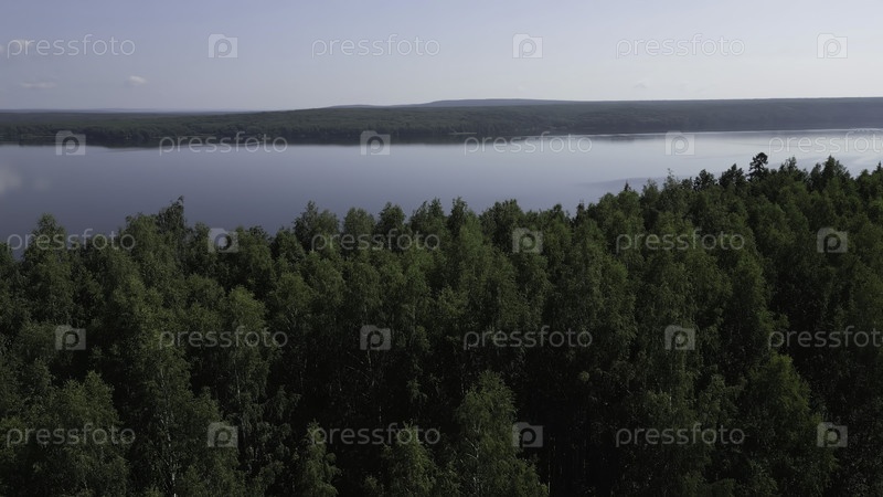 Потрясающий вид на густой лес, красиво сливающийся с спокойным озером под чистым голубым небом