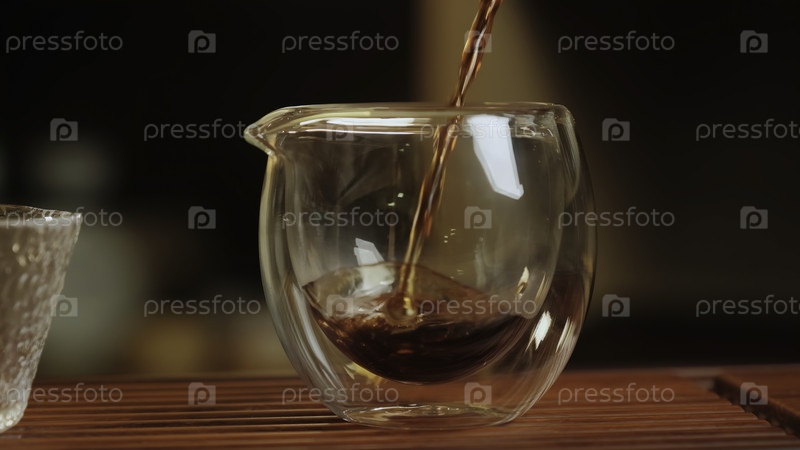 Клубовое изображение чая, заливаемого в прозрачный чайник, демонстрирующее элегантный поток жидкости