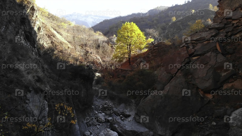 Золото-желтые осенние деревья, стоящие в скалистом горном каньоне
