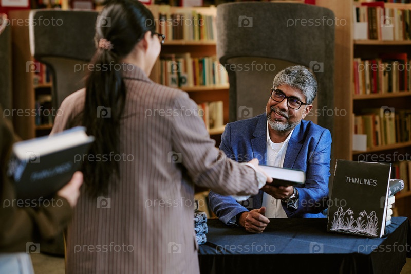 Мужчина среднего возраста подписывает книгу для молодой взрослой женщины на презентации
