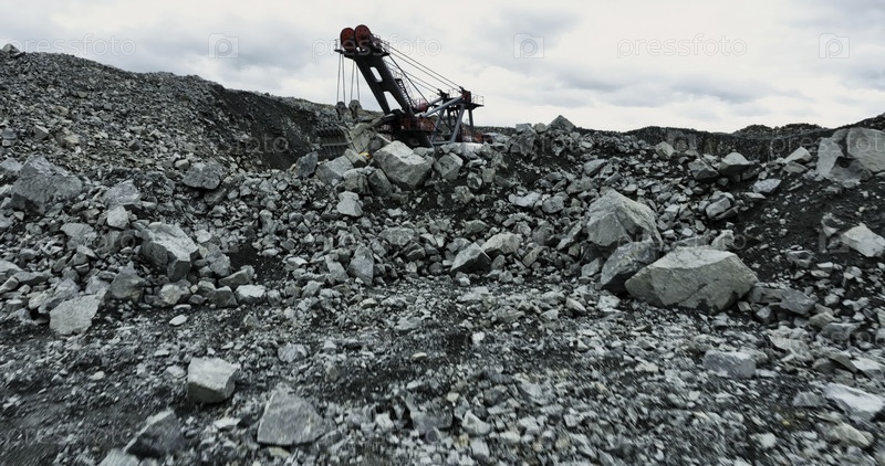 Экскаватор загружает сварочный грузовик в открытую шахту