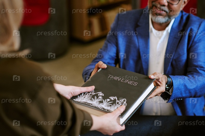 Мужчина средних лет Автор вручает книгу женщине среднего возраста